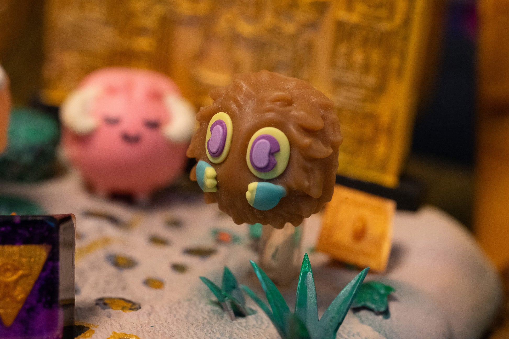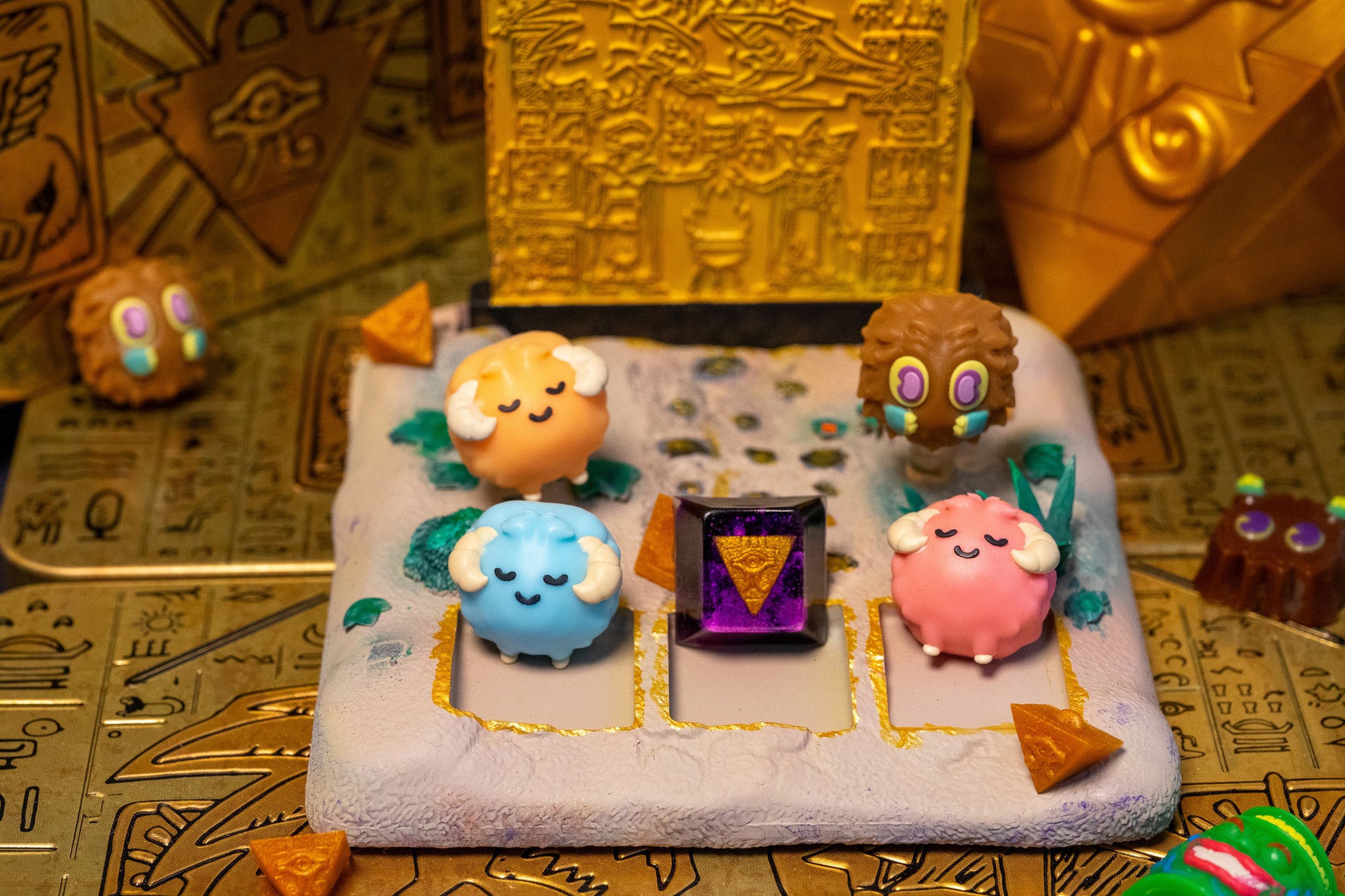 Yami Yugi's trusted companion is reenvisioned as a keycap! Kuri is a fluff ball that is super cute. This picture was taken with some super warm soft lighting to emulate the desert sun. Kuri is ready to help you get through tough times : ) This purchase is not copium its totally a valid response to how you feel ! ! !